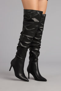 The definition of drama. These scrunch thigh-high boots strike the perfect balance of luxe and daring, with a pointed toe and sleek stiletto heel made to elevate all your fall outfits.
