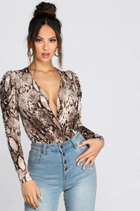 Make major moves in this trendy piece bb! This snake print bodysuit can easily be paired with denim or edged up with faux leather.