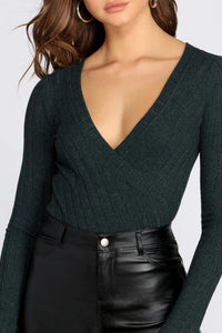 Keep it chill for a bit in a comfy laid back bodysuit! Designed with a V neckline, long sleeves, and a surplice cross over bodice. Bodice leads to a lined cheeky bottom with a double snap closure. Bodysuit is composed of a woven ribbed knit material that offers a form fit with moderate stretch.