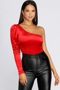 This bold velvet bodysuit is perfect for all your holiday parties! It features a one shoulder neckline with a puff shoulder and a fitted long sleeve, a high waist seam, and a knit thong bottom with dual snap button closures. The velvet fabric offers moderate stretch and a form-fitting style.Style Number/Barcode: 06001-2140