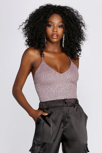 You're such a glitter girl, and this shimmering bodysuit is so you! It features a sleeveless bodice, spaghetti straps that lead to a cross back, a V neckline, and a thong bottom with dual snap button closures. The glitter knit fabric has moderate stretch and offers a form hugging fit.