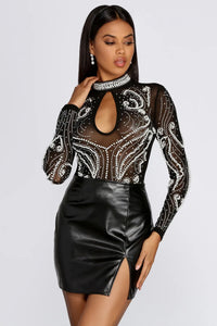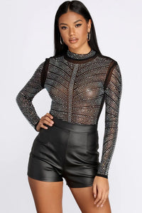 Make it a night full of glam in a sparkling and sexy bodysuit! Designed with a mock neckline, long sleeves. Mock neck leads down to a cheeky bottom and a double snap closure. This black bodysuit is composed of a mesh material that offers moderate stretch.