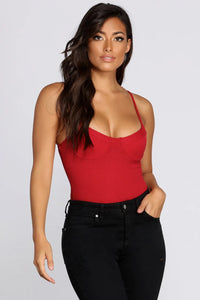 Hot fire alert! What we are loving about this bodysuit is how versatile it is! Wear on a casual day out, or dress it up! Featuring a sweetheart neckline, spaghetti straps that are adjustable, and a cheeky bottom. Top has a bustier designed cup, and is composed of a knit ribbed material that offers moderate stretch.