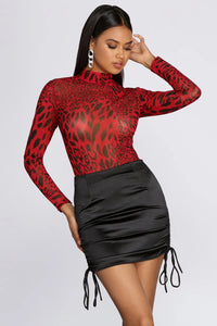 Hey there hot hottie! Try out a fire bodysuit this weekend, I mean..you'll look bomb so why not!? This bodysuit is designed with a mock neckline, long sleeves, and a form fitting silhouette that leads down to a thong bottom with a snap closure. Back of suit has a keyhole cut out and a button closure at the top.Composed of a sheer mesh material that showcases a leopard print that we are all obsessed with! Pair with your favorite high waist bottoms and you're good to go!