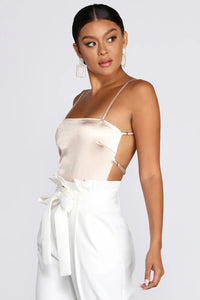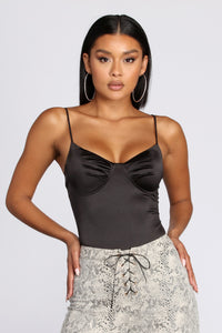 Get away this weekend, but don't forget to take some staple pieces with you! With a sweetheart neckline and spaghetti straps that are adjustable, this piece is a go to! Cups are wired and bodysuit is composed of a form fitting satin material that offers slight stretch.