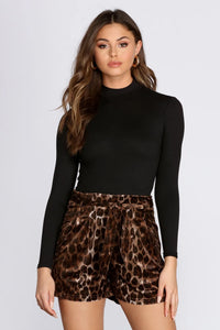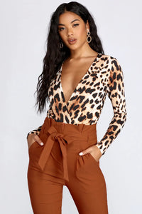Fab and fierce, you know how to work it! This leopard printed bodysuit features long fitted sleeves, a plunging V nekcline with a wrap front, and a thong bottom with dual snap button closures. The bodysuit is composed of a stretchy knit fabric, offering a form hugging fit.