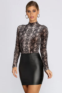 Slide in with style boo! This bodysuit is designed with a mock neckline, long sleeves, and a fitted bodice that leads down to a cheeky bottom with a snap button closure. Hidden zipper closure is located at center back and is composed of a velvet fabric that offers moderate stretch and showcases a luxurious snake print pattern.