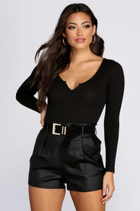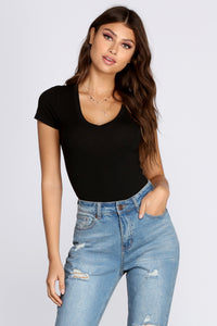 Dress up or dress down with a basic bodysuit! This must have features a plunging V neckline, long fitted sleeves and a cheeky bottom with snap button closure. Bodysuit is composed of a double lined smooth knit fabric that offers a form hugging fit with a moderate stretch.