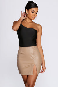 Edge up your look with this one shoulder knit bodysuit. It features long fitted sleeves, a single tank shoulder strap, and a thong bottom with dual snap button closures. The ribbed knit fabric offers plenty of stretch and a form hugging fit.