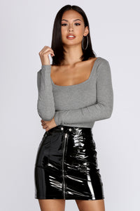 Layer up with this basic bodysuit to create head-turning looks this season! The bodysuit features a square neckline, fitted long sleeves and a thong bottom with snap button closure. Bodysuit is composed of a ribbed knit fabric that offers a form hugging fit with a moderate stretch.