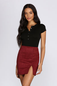 Hey stunner, show off your cute style in this snap detail henley bodysuit! It features short sleeves, a three snap button down detail along with faux snap buttons, and a thong bottom with a dual snap button closure. Bodysuit is composed of a ribbed knit fabric with plenty of stretch and a form hugging fit.