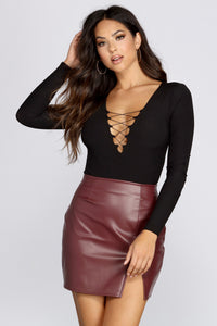 Falling for a bodysuit with all the right features! Long sleeves, a deep V neckline, and a form fitting silhouette. Bodysuit also features a lace up design down the center that gives off a flattering finish! Composed of a knit fabric with plenty of stretch.