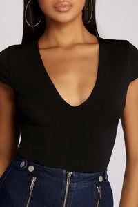 Make the perfect first impression in this wowing bodysuit! It features a black hue, a plunging wired sweetheart neckline, cap sleeves and a thong bottom with snap button closure. Bodysuit offers a curve hugging fit with a moderate stretch.Model is 5'9" with a 32" bust, 24" waist and 34" hips. She is wearing a size small.