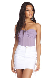 This twist front ribbed knit bodysuit has the perfect shade of lavender for the springtime! It features a strapless sweetheart neckline, a twist front detail, a straight elastic banded back, and a thong bottom with snap button closures. The bodysuit is composed of a ribbed knit fabric with moderate stretch.Model is 5'8" with a 32" bust, 24" waist and 35" hips. She is wearing a size small.