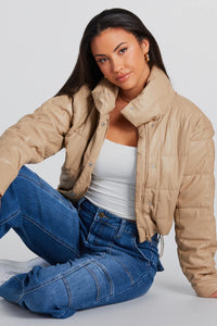 Stay sleek and cute as can be in this faux leather puffer jacket perfect for the chilly season! It features long sleeves, a standing collar neckline with snap-button closures for extra warmth, a hidden front zipper and snap-button closures, front pockets for keeping your hands warm, and an adjustable drawcord cropped hem. The jacket is crafted from a quilted faux leather-insulated woven fabric that helps keep you warm and protected. Complete the look in boots for holiday activities or casual hangs!