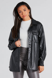 Have a major cool-girl moment in this trendy long faux leather shacket, an edgy winter staple. It features a collared neckline, long sleeves, a button-down front, dual chest and side pockets, a long hem, and an overall relaxed fit for a laid-back vibe. The sleek faux leather fabric has a minimal amount of stretch. Layer over a casual dress paired with knee-high boots.