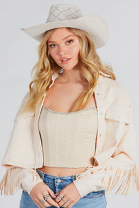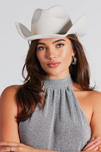 This rhinestone cowboy hat features an eye-catching rhinestone grid pattern and luxe faux micro suede. Its curved wide brim provides stylish protection from the sun while giving you an unforgettable look. Includes adjustable ties hidden on the inside for a tighter fit. Style with a trendy rhinestone denim jacket.