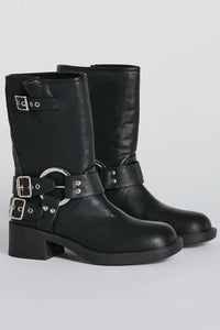 The sleek deets of these strappy faux leather biker boots will give your 'fits a trendy vibe. They feature a mid-calf height, multiple straps with studded accents and buckle details, a large O-ring accent, a round toe, and a short block heel. Style with a bomber jacket for an elevated edgy look.