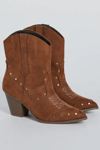Giddy up and show off that country style in these trendy faux suede western booties! They feature an above-the-ankle height, a pointed toe, a stacked block heel, and western-style stitching with sleek studded accents. Pair these boots with a denim jacket and hoop earrings for a concert!