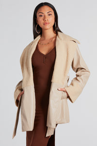 When the chill hits, you'll want to wear this faux leather trench coat to keep stylish and toasty! With long sleeves featuring faux sherpa cuffs, a faux sherpa lapel collar neckline, a tie-front belted waist, hidden side pockets to keep your hands warm, and a mid-length hem, you'll turn heads in style and luxury. Complete the look in knee-high boots.