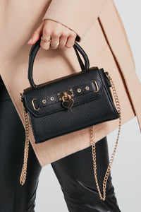 Fall head over heels for this adorable mini satchel handbag! With its top handle, detachable chain shoulder strap, and front flap with snap-button closure plus a pretty strap with dazzling rhinestones and a metal heart lock charm, this mini bag is a must-have. Plus, its lined interior and faux leather texture make it as practical as it is chic. Style with stiletto heels for day or night plans.