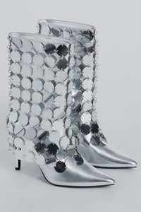 Show up and slay in these iconic sequin stiletto boots that will showcase flashy glam vibes! They feature a mid-calf height with a shimmering sequin chain-link draped design, a pointed toe, and a sleek stiletto heel. Style these boots with a bodycon dress and a moto jacket for such a fab going-out look.