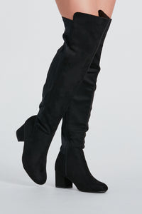 These chic block heel over-the-knee boots are a staple you'll love to style up this season! They feature an over-the-knee height, a complete inner zipper closure for easy on-and-off wear, an almond-shaped toe, and a block heel. The boots have a trendy design of microsuede at the front with smooth spandex at the back. Pair these boots with a sweater dress and a fringe scarf.