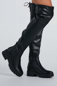 Stomp it up in these faux leather lug boots to elevate your everyday style! They feature a round toe, inner zipper closure, a sturdy lug sole, and a thigh-high shaft with an elastic insert and tie for easier on-and-off styling. Complete the look in a basic smooth knit dress and jacket!