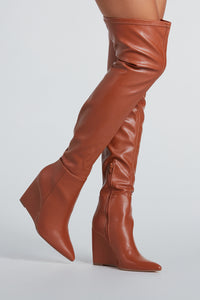 These faux leather boots stand out from the crowd! They feature a pointed toe, an inner zipper closure, a trendy wedge-style heel, and a sleek over-the-knee shaft height. Complete the look with a crossbody bag for day or night plans!