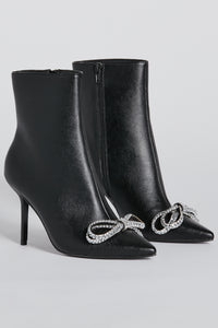 Give yourself the gift of these faux leather booties for fabulous struts! They feature a sleek pointed-toe with an eye-catching rhinestone bow, an inner zipper closure, a stiletto heel, and an ankle-length fit. Complete the look with a chic purse for day or night plans!