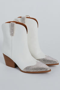 It's always sparkle time with these totally fab rhinestone western ankle booties! They feature an above-the-ankle height with rhinestone-adorned pull tabs, a pointed toe with a rhinestone-embellished toe cap design, a stacked block heel, and western-style seams on the sleek faux leather material. Pair these boots with a sleek clutch to complete your 'fit for a concert.