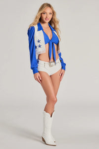 Channel an iconic star cheerleader for Halloween in this sexy three-piece costume set! It features a tie-front crop top with a collared V-neckline and long sleeves, a cropped fringe vest with embroidered star appliques, and low-rise hot shorts with a star applique buckle belt. Complete your costume with cowboy boots!