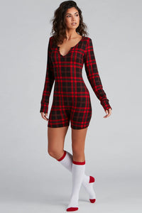 Get into the holiday mode with a pajama romper that ushers in those cozy vibes. The romper features a plaid print, V-neckline with buttons, long sleeves, and mid-thigh length shorts. The romper also includes crew fit socks. Complete look with slippers.