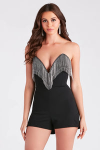This ultra-fab chain fringe romper was made for after-dark fun! It features a strapless plunge-wired V-neckline, front cascading ball-chain fringe trim, a high waist seam, and a short, cheeky, form-hugging fit. The crepe fabric offers a moderate stretch and includes a knit lining at the bust. Complete your club 'fit with your fave platform heels.