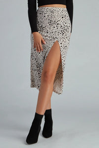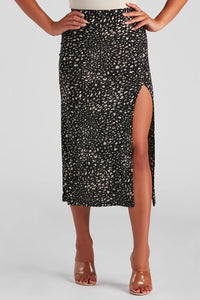 You'll be feelin' fab and fierce in this adorable leopard printed midi skirt. It features a high-rise waist, a chic high front slit, and a mid-length, relaxed silhouette. Style this skirt with a basic bodysuit and cute mules.