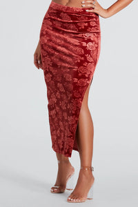 With this midi skirt, you won't be asking yourself if they love you not! It features a high-rise waist, bodycon silhouette, and a sultry velvet floral burnout pattern with a sewn-in knit lining. Complete the look with the matching top for a date!