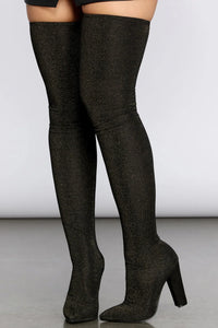Get your midnight kiss in a pair of sparkling thigh high boots! They are bound to take any outfit to the next level, and offer a comfort with the knit fabric shaft design!