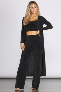 Add a glittering touch to your night! Designed with long sleeves, and a long hemline that reaches ankle length, this duster is a glam way to amp up your look! Composed of a glitter knit mesh material that offers moderate stretch. Complete your look with the matching crop top and wide leg pants!