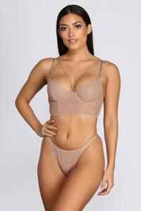Glow on in this dazzling lingerie set! It features a wired bralette, adjustable straps, caged strap accents, a multi row hook and eye closure and sparkling heat stones throughout. The matching panties feature a high rise waist with elastic side accents and cheeky coverage. Set is composed of a lined glitter knit fabric that offers a relaxed fit with minimal stretch.
