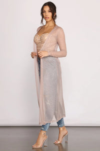 Look oh-so-girly in this gorg glitter knit duster! It features long fitted sleeves, a drape open front, and a flowy fit. The sheer glitter knit fabric offers plenty of stretch. Layer this duster over an embellished bustier and pair it with high waist denim for a glam vibe.