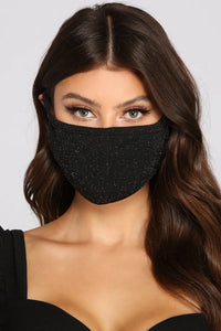 Stay protected in style with this glitter face mask! It features a woven material with exterior glitter detailing and ear loops. Pair it with a mini dress and matching glitter bag.