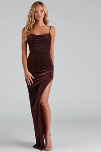 Bring the luxe looks to your formal soiree in the sultry chic Taylor mermaid dress. She features a sleeveless cowl neckline, spaghetti straps that lead to a lace-up back, and a floor-length fitted mermaid silhouette with a stylish thigh-high front slit. The dress is composed of a glitter velvet fabric that will bring the glamorous vibes. Complete the outfit with gold hoop earrings.