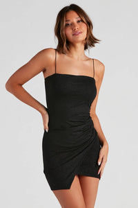Reach a state of sparkly bliss in this glitter wrap mini dress for your next vegas weekend! It features a sleeveless, square neck, spaghetti straps, an asymmetrical wrap skirt, and bodycon silhouette. Complete the look in glam earrings.