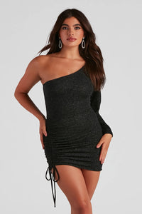 Your evening is looking sparkly in this glitter mini dress for your next celebration! The short dress features a one-shoulder, long balloon sleeve design, front tie ruching on a bodycon silhouette, and a short-length hem. Complete the look in statement earrings.
