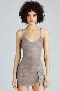 Glisten and gleam all night in this glitter skort romper! Featuring a sleeveless, spaghetti strap design on a v-neckline, fitted bodice, slit accent skirt, with shorts underneath. Complete your party fit' with suede booties.