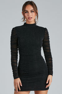 Shine like the queen you are in this glitter dress for the holidays! It features a mock neck, long sleeves, and a mini-length hem with all-over ruching to accentuate every curve. The knit-lined fabric offers a moderate stretch. Complete the look in hoops and booties.