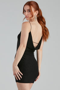 Set the trend in this glitter mini dress for your next girl's night out! It features a sleeveless, bungee spaghetti strap, cowl neckline, bodycon fit, and a low-back with a cowl accent. The dress is composed of a knit-lined fabric with a moderate stretch. Complete the look in lace-up heels and hoops.