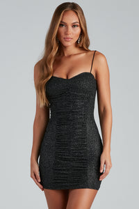 Radiate the dance floor lights in this glitter bodycon dress! It features spaghetti straps, a sweetheart neck with built-in bust support, and a ruched, bodycon silhouette on a short-length hem. Composed of a mesh knit fabric with a moderate stretch. Perfect for styling with a chic bracelet.