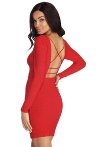 Raise a toast in this party ready mini dress! It features a wide round neckline, fitted long sleeves and a sexy open back with mini bar straps and an cross back design. Dress is composed of a bold red hued lined glitter knit fabric that offers a form hugging fit with a moderate stretch. Glitter will transfer.