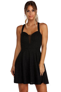 Make a move in this stylish black skater dress! It features a sleeveless bodice, a sweetheart neckline with an unlined V neck mesh inset, padded cups and wide shoulder straps that cross at the back. The slim fit bodice leads to a fluttering skater length silhouette. Dress is composed of a lined textured glitter knit fabric that offers a relaxed fit with a moderate stretch. Includes a back zipper closure. Glitter will transfer.Model is 5'6.5" with a 32" bust, 23.5" waist and 35 hips. She is wearing a size small.